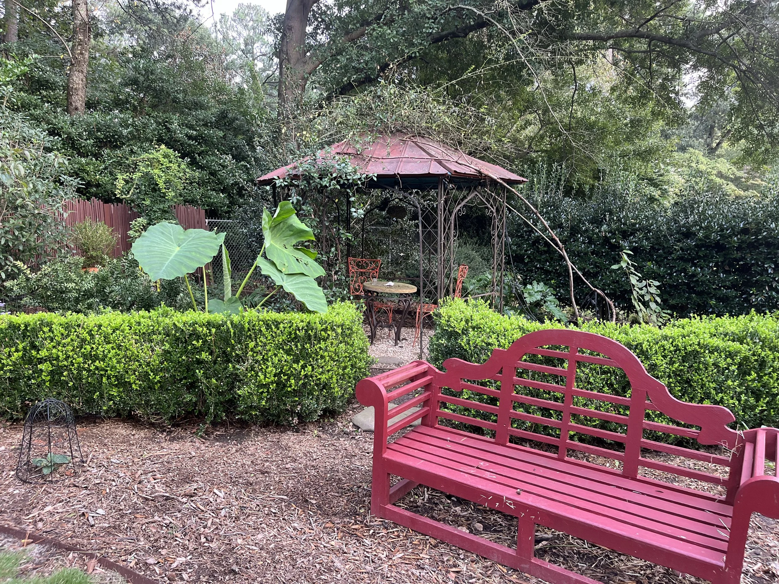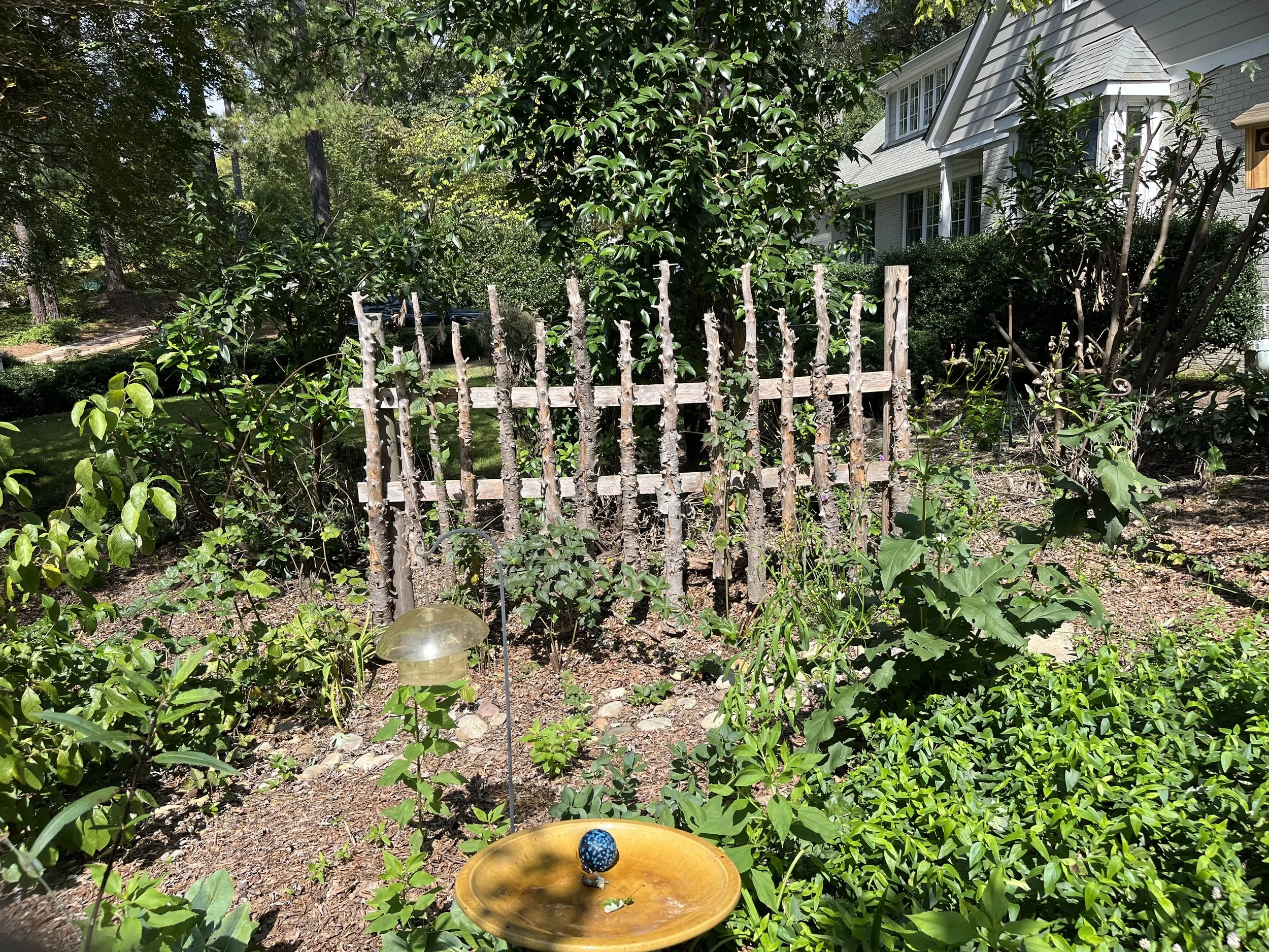 The North Side—I opened up a new area here. I’ve made stutter starts over the years to improve it. It is going from a compost pile to now a sitting area. My neighbor’s ligustrum looks terrible on my side, so I nicked it in places so it could give me more green.