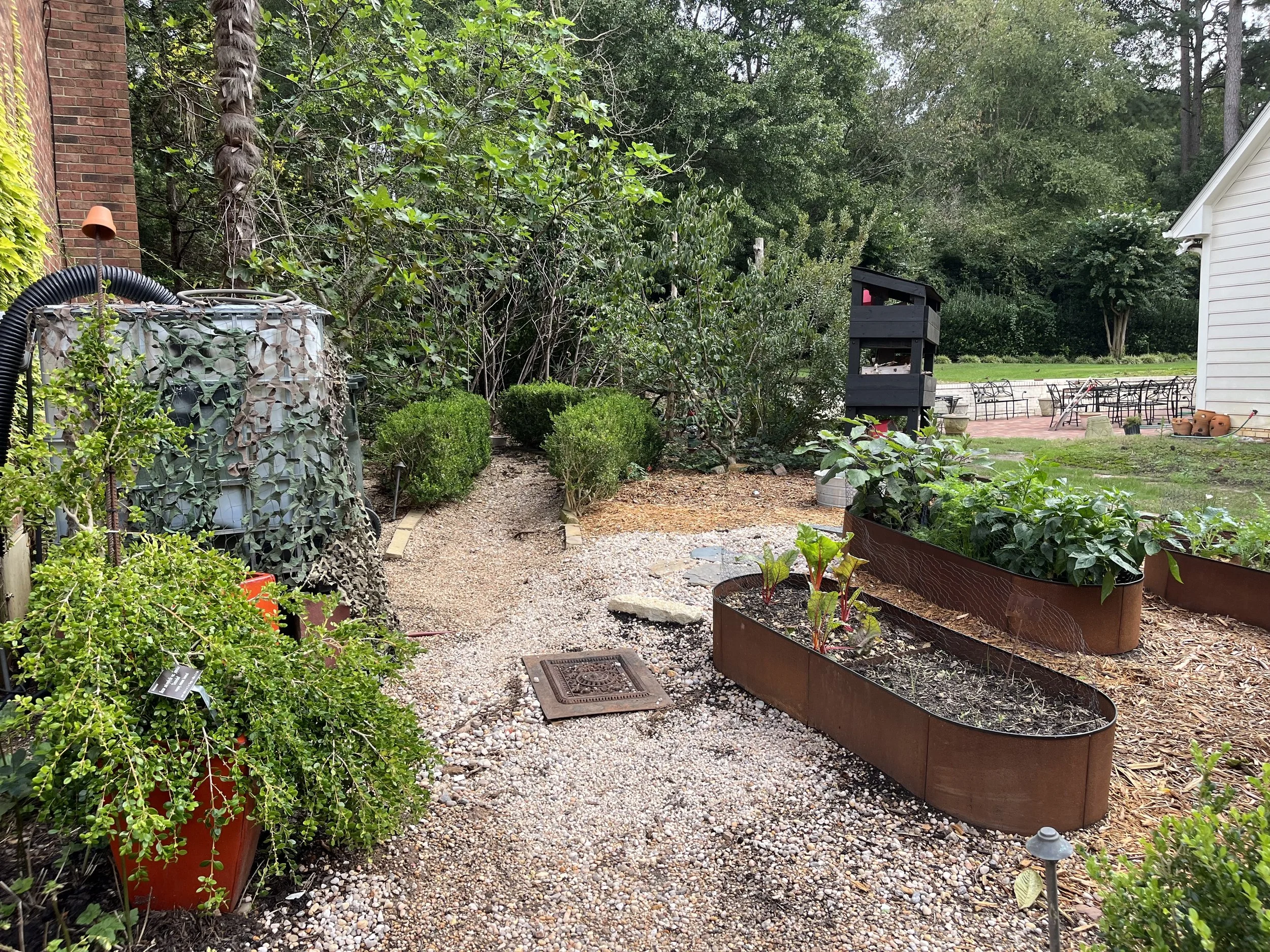 The Southside— is where the giant Southern magnolia was removed—just 15 feet off the house, standing 80. The removal opened up a lot of sun, so I put in raised beds for veggies. I’ve always had the same amount of vegetables, but now they are all in one place. I love that! I often forget to care for them—out of sight, out of mind.