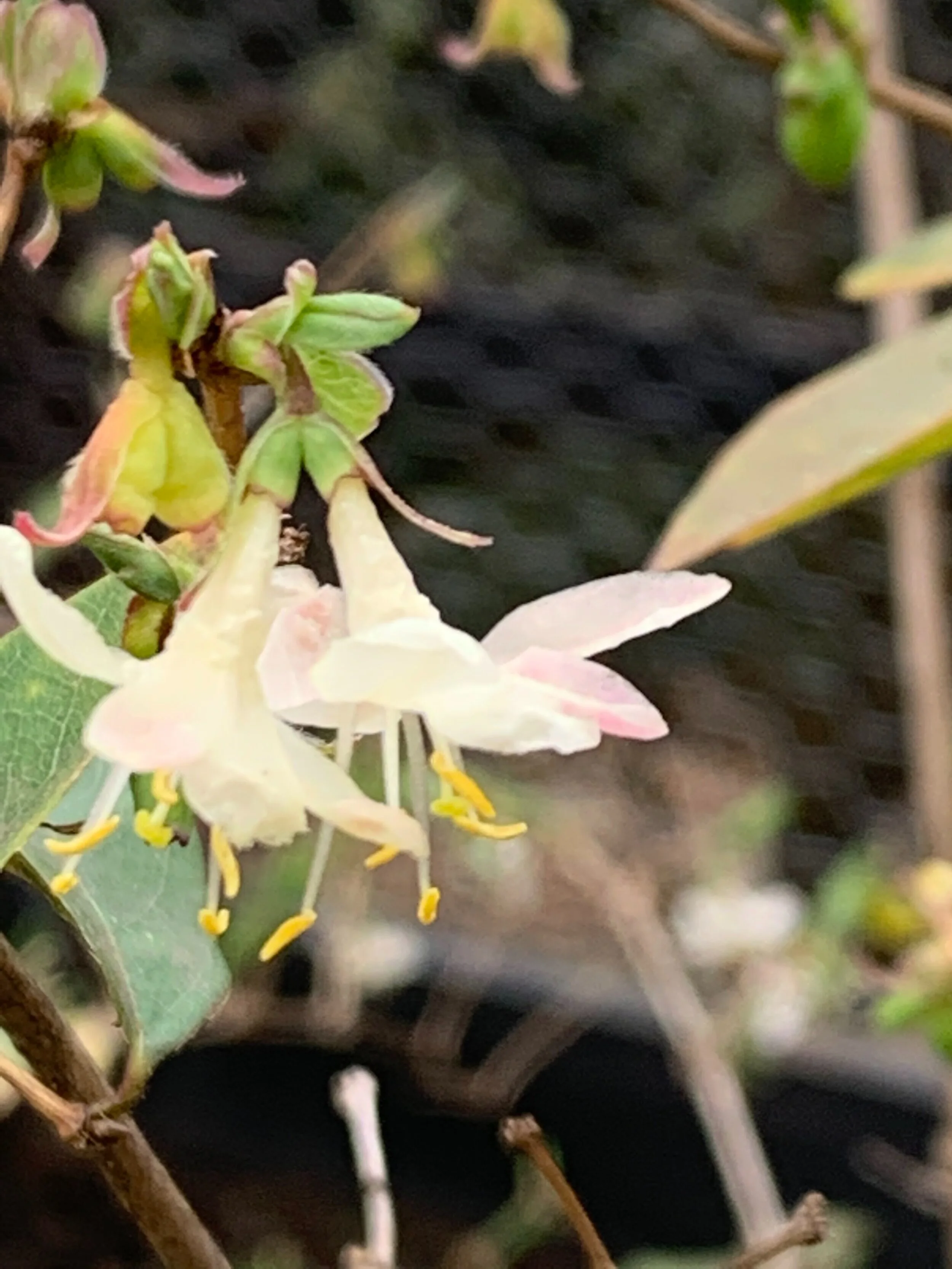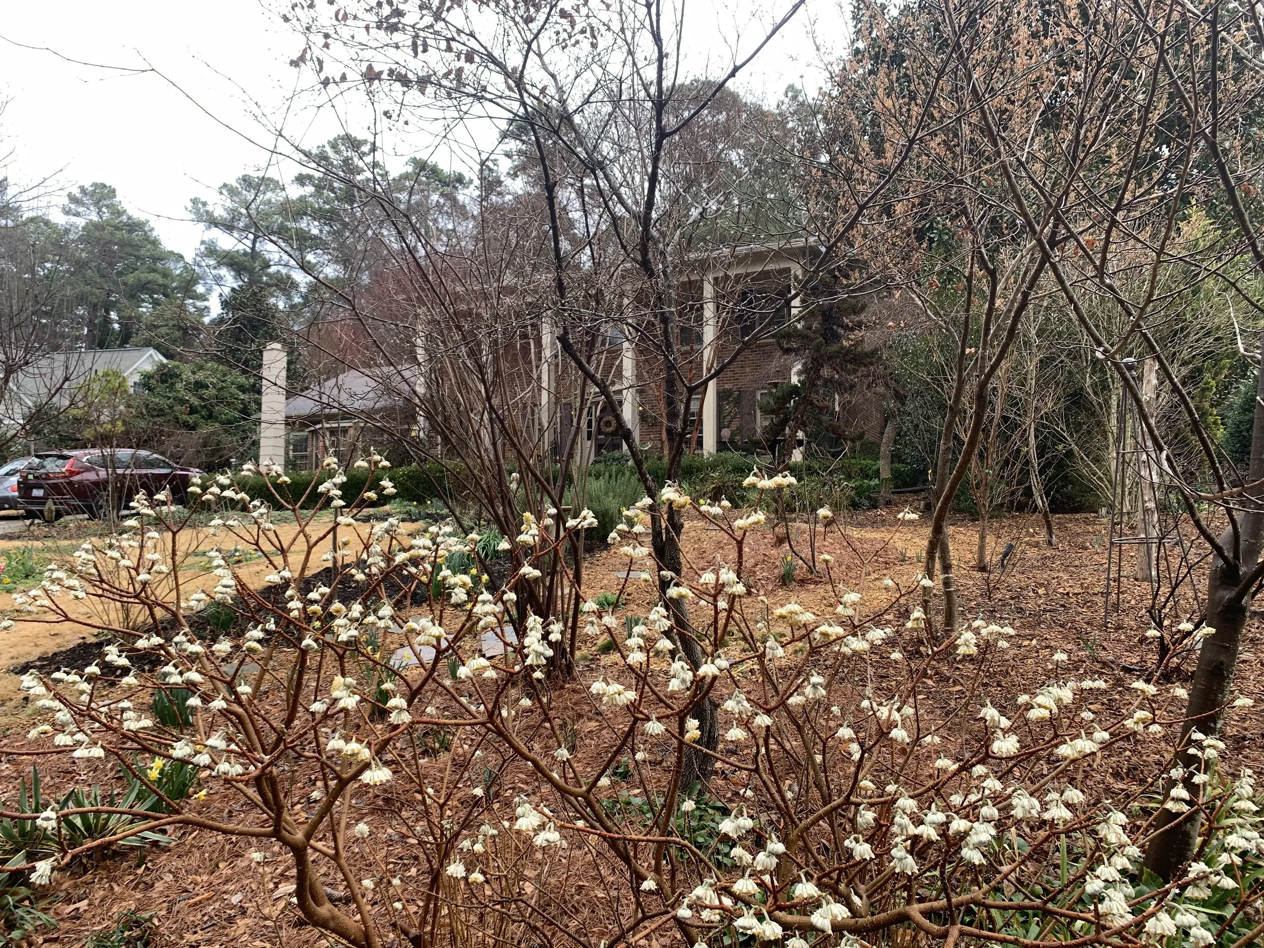 Winter honeysuckle, Lonicera fragrantissima. I understand in many mid-western states, this is a noxious weed. Fortunately, not so in the Bee Better Teaching Garden!
