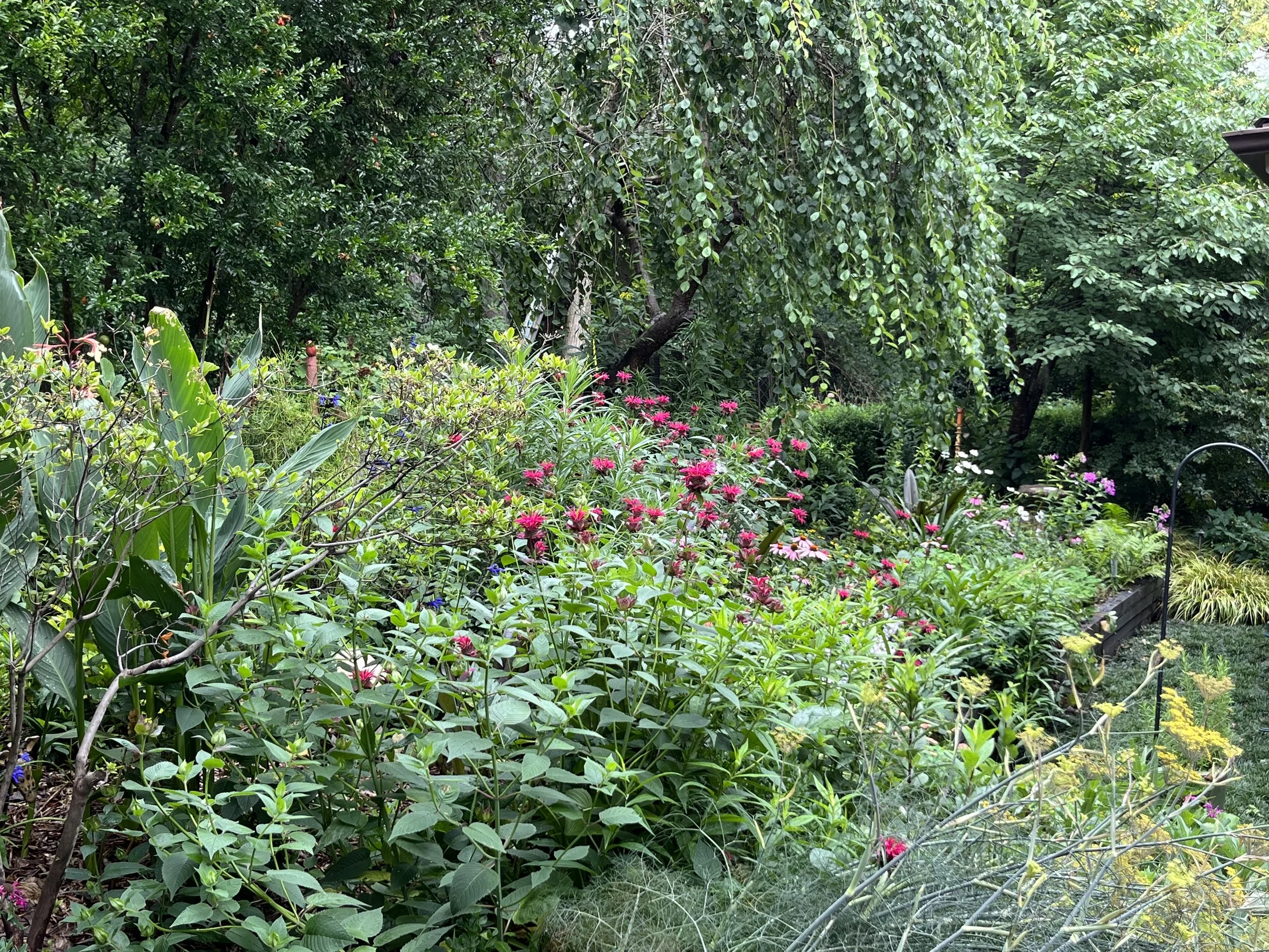 My mixed border is right off our back patio. There are trees in the beds (there is a long bed and a short bed, separated by rock steps through the area.) Once you reach the top of the steps, I call this area the upper garden. I didn’t want too many large plantings screening out the upper garden; plus, the scale of taller plantings wasn’t necessary since the border is viewed up close.